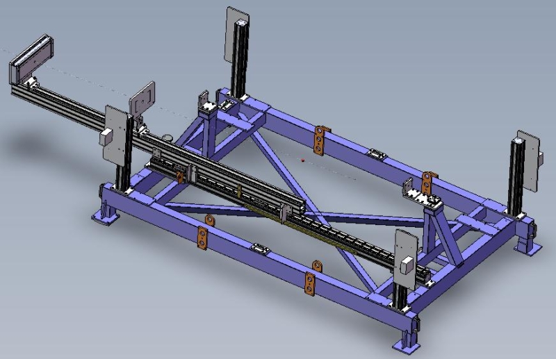 精密制作的功能集成式标定架用于标定测量系统的零点验证。 功能集成标定架采用铝合金制作。通常保存在工位顶部,通过电葫芦、轨道以及吊挂件,标定架在标定时可从该工位安放到台架上面。